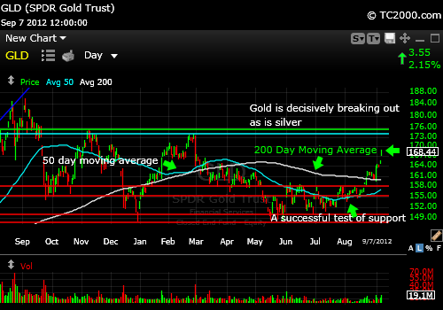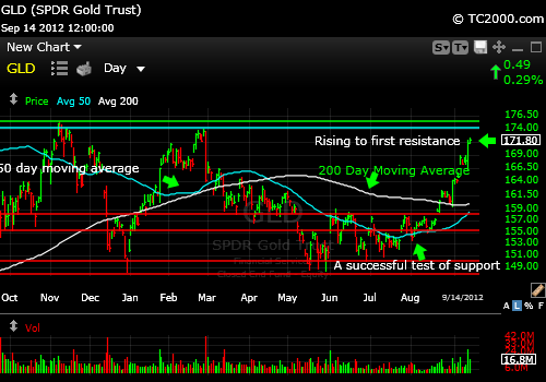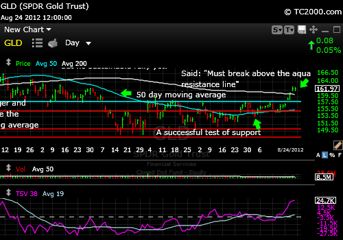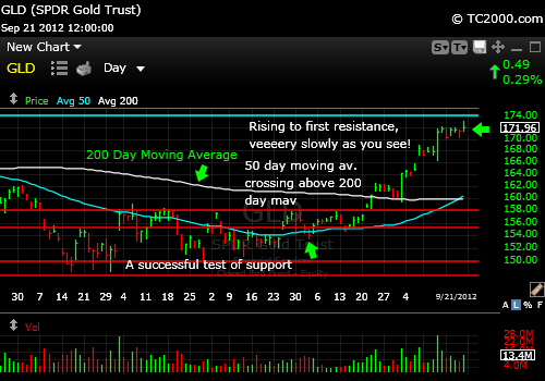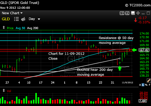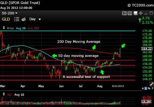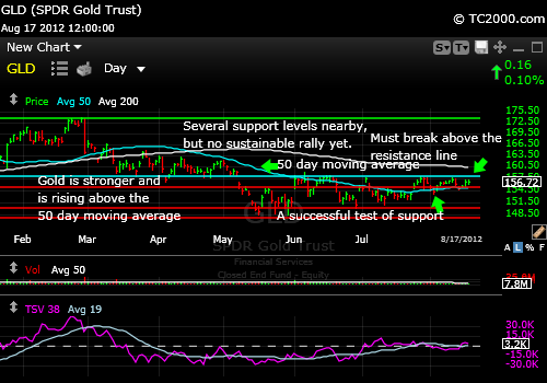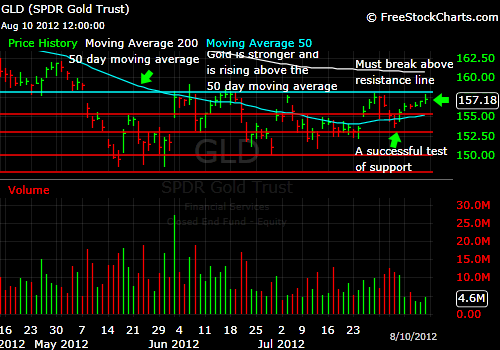 GLD ETF Market Timing Chart for 7-13-2012 close The gold ETF has survived a retest of support thus far as the chart shows below, although it failed to close above the 50 day moving average. That is the next hurdle for the Bulls.