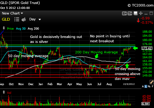 GLD ETF Market Timing Chart for 5-04-2012 Close Gold is about to declare itself in an important move. Trading against the next move won't be a good idea. If it breaks the base, it will suffer significantly more damage, at least if it goes below the April low. Moving up through that red down trend line on the chart will be a sign of strength and a buying point for Bulls.