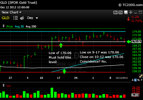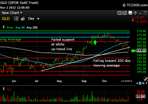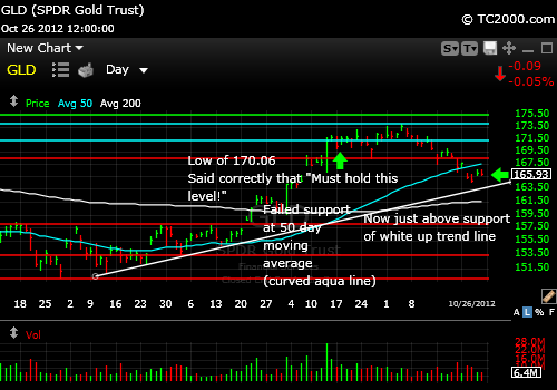 GLD ETF Market Timing Chart for 4-20-2012 Close Gold is attempting to find support at the red line in the chart.
