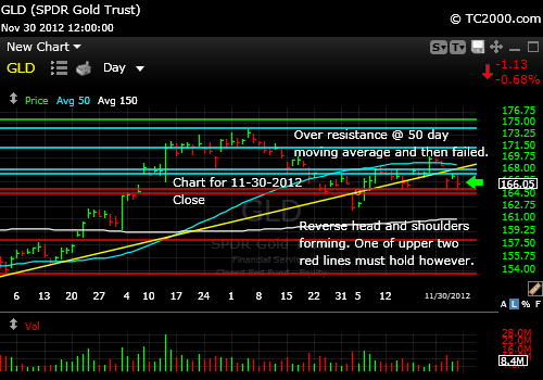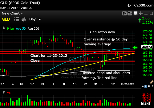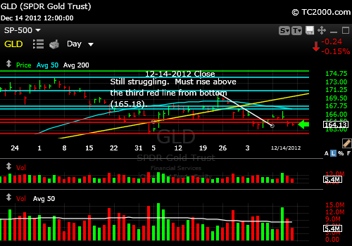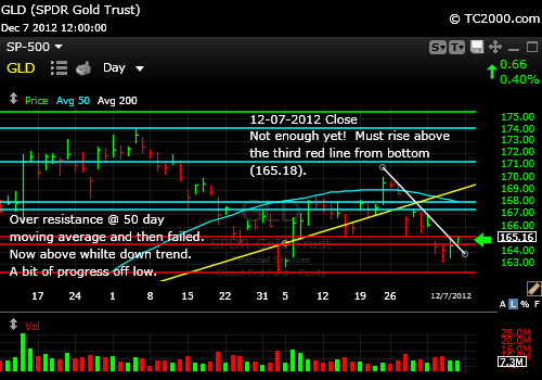 GLD ETF Market Timing Chart for 4-27-2012 Close Gold is moving up a bit but was held back by the red downtrend line on the daily chart shown below.