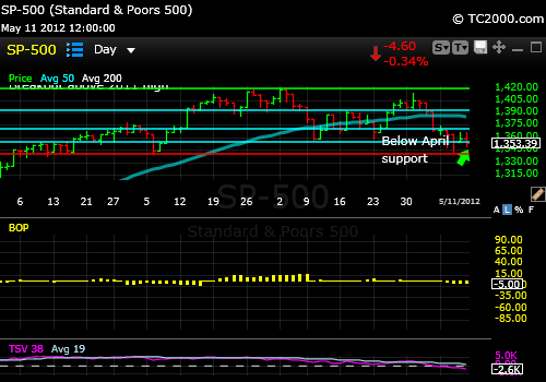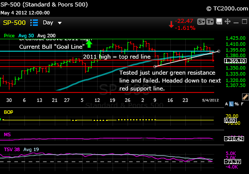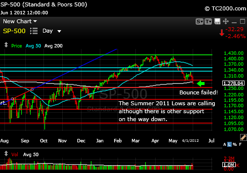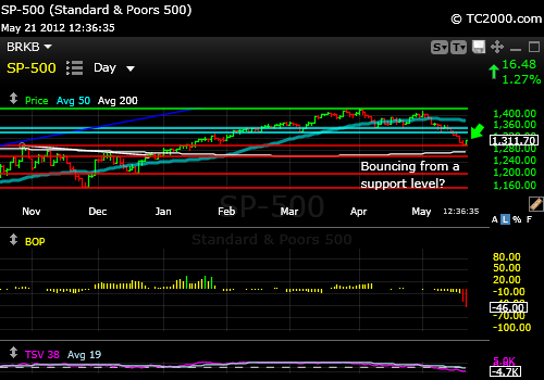 5-21-2012 Chart at 12:36 pm ET: The SP500 Index could bounce from here or after one more whoosh down as discussed in further detail in my free weekend report. Subscribe via the link to the upper right.