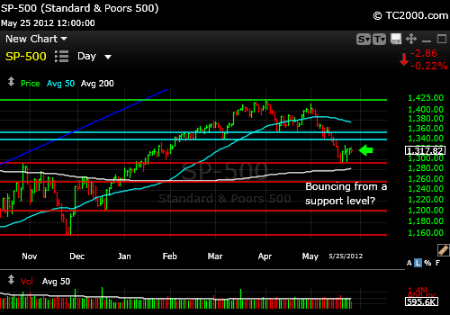 5-25-2012 Chart at close: The SP500 Index could bounce from here given the sideways move (consolidation) this week. Further details in my free weekend report. Subscribe via the link to the upper right.