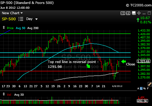 06-08-2012 Chart at close: The SP500 Index rallied hard on Wednesday and then failed to make it back above the prior high. That is the key resistance point along with the March 2011 low. It is unlikely that the market can get past resistance without further central bank action. Further details in my free weekend report. Subscribe via the link to the upper right.