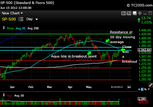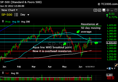 06-15-2012 Chart at close: The SP500 Index has now rallied above the 6-11-2012 high and over the 3-06-2012 low as well. It was impressive that it happened with the Greek elections pending. Sometimes the market won't budge until the uncertainty clears, so the behavior is very positive. The next resistance is at the 50 day moving average just above the close on Friday and the aqua lines above that on the chart below, which marks the 4-10-2012 low. Before that the 2-29-2012 high represents a bit of resistance as well (1378.04). Then the 5-1-2012 high is next major resistance, then the top marked by the green line.