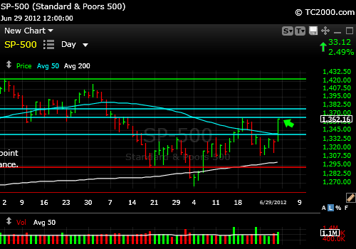 06-29-2012 SP500 Index Chart at close: Last week I wrote: "For the Bears, this would be the perfect place for the market to continue downward to the May 21st low of 1315.99." We in fact tested just below there at 1309.27 and bounced. The SP500 Index made it over the March 2012 low and is now challenging resistance as the chart shows below. There is much more in this week's newsletter (link to upper right).