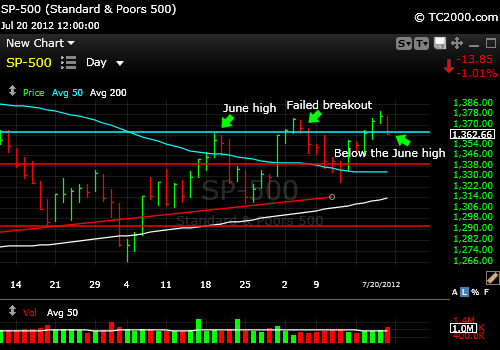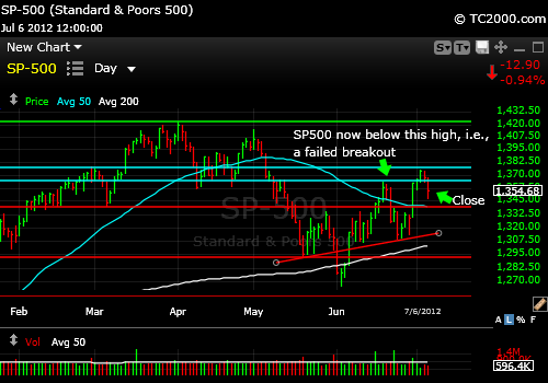 7-20-2012 SP500 Index Chart at close: The index has now reversed a triple top. This is not good for the Bullish case. It is at least worth a mild pullback to one of the support levels reflected by the lines beneath the current price on the chart below.
