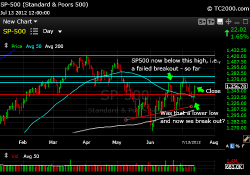 7-13-2012 SP500 Index Chart at close: Despite the failure of the prior breakout, the index has now made a higher low. That much the Bulls have. There is immediate overhead resistance shown by the two aqua horizontal lines. There is Fed testimony next week that could strongly impact a market that seems to believe that the Fed will be loose with its money come the August Fed meeting. If they do take action, the election will go to President Obama as the stock market will likely continue to rally. Does the Fed want to have that sort of influence? I'll let you answer that one!