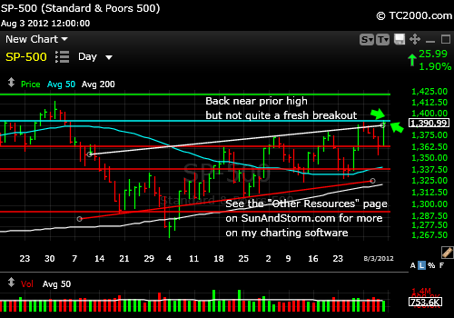 8-03-2012 SP500 Index Chart at close: The index was reinvigorated by the sense that the Europeans will now follow through to save the Euro currency. But watch the 10 year Treasury Note chart as shown on the home page this week (click the button on the upper left)! It will be the biggest "tell" on where the stock markets will head next. Please subscribe to the newsletter to read even more! The link is to the above right.