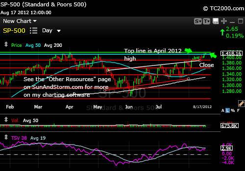 8-17-2012 SP500 Index Chart at close: The index has broken through the first layer of overhead resistance and is up against the top layer this week. It could end here, but the 10 year Treasury Note chart will be the key to predicting the stock market this week as well. If Treasuries rally now, the stock market will correct and the Bulls will lose the ball, which they clearly have had. Please subscribe to the newsletter to read even more. The link is to the above right.