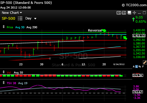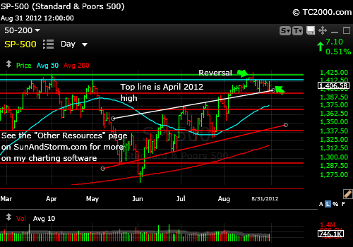 8-31-2012 SP500 Index Chart at close: The index has failed to make a new high of late, having pulled back from a failed breakout recently (see chart below). The SP500 Index was still having trouble staying above 1415.3 this week and that remains the immediate challenge for the market. Please subscribe to the free weekly newsletter to read more. The link is to the above right.