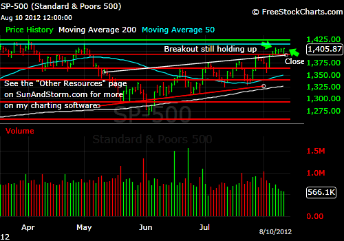 7-27-2012 SP500 Index Chart at close: The index pulled back as expected and after I noted the similarity of the pattern to the prior two pullbacks and reported it on Twitter, we bounced right on schedule. Now we could have stopped dead at the prior highs (triple top discussed last week; see below), but we did not in fact stop there. So we have a breakout for the Bulls to munch on this week. If it reverses, watch out below, but now the pressure is on the Bears. I'll give you a little more guidance than this in this week's free issue, so please subscribe to the newsletter to read even more! The link is to the above right.