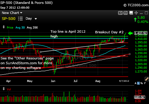 9-07-2012 SP500 Index Chart at close: The index has FINALLY jumped to a new high and faces immediate resistance at the 5-20-2008 high and then the 2007 highs. What a run after a massive fall. This week the SP500 Index cleared 1415.32 and then 1422.38, which was the prior high on 4-2-2012. Day 3 above the breakout point may be the charm the market needs to make it all the way back to the 2007 high. Please subscribe to the free weekly newsletter to read more. The link is to the upper right.