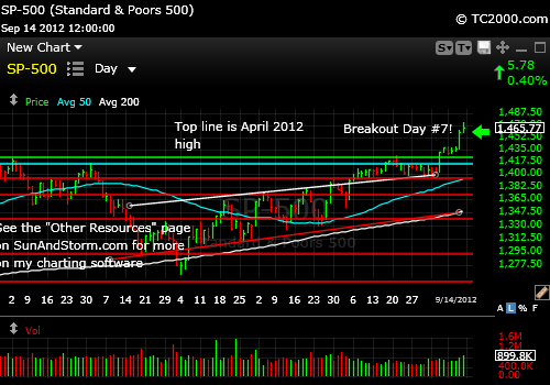 9-14-2012 SP500 Index Chart at close: The index sustained a breakout for 5 days and then took another giant leap up following the Fed announcement. The first jump up above the April 2012 high was due to the ECB statement saying they will buy bonds in "unlimited" amounts. Free money all over the world. Whoopee! Inflation here we come.