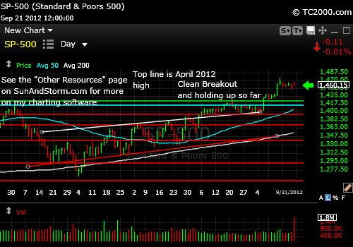 9-21-2012 SP500 Index Chart at close: The index has been levitating for the past few days. It has to either move up and out of this consolidation or we're in for a bit of a pullback.