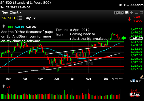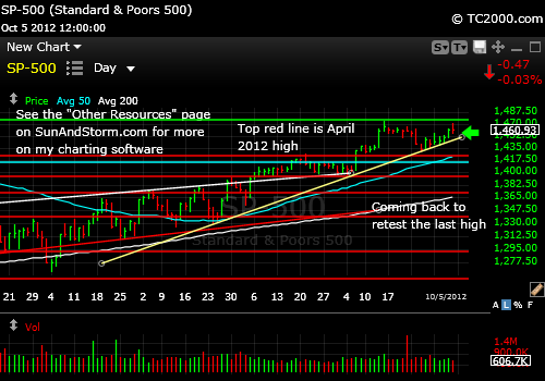 10-05-2012 SP500 Index Chart at close: The index has essentially re-topped. This sometimes happens in the course of a correction. The market tests various resistance several times, and if it does not make it through, the next logical direction is down.