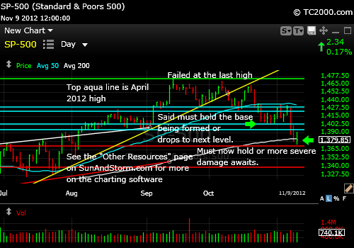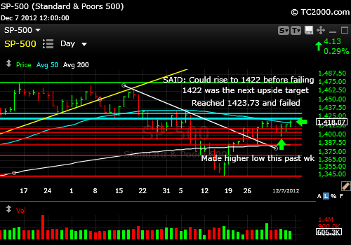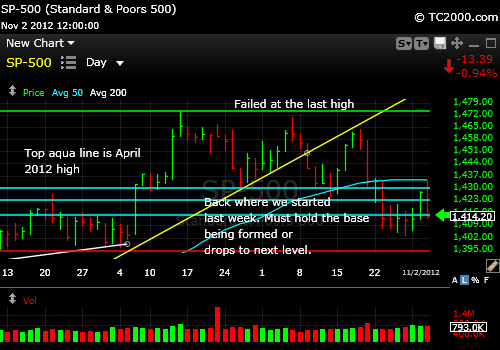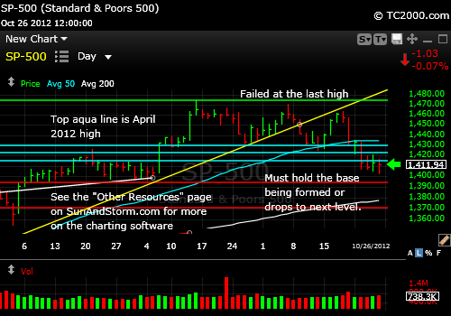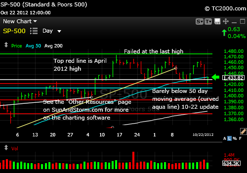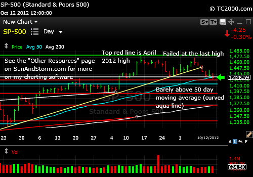 10-12-2012 SP500 Index Chart at close: Weakening but on Support The index is now just below the late September low and is barely above the 50 day moving average as shown in the chart below. The next test in a continued correction, if that happens, is 1420.38, the 4-02-2012 high. August support around 1396.56 would be next after that. Be sure to also check out the homepage and GLD charts for this week as well.