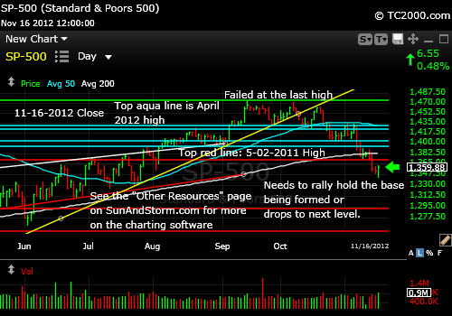 5-11-2012 Chart: The SP500 Index was back below support at the end of the trading week. Negative and suggests further downside as noted in further detail in my free weekend report. Subscribe to the upper left.