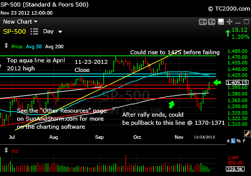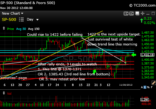 UPDATE 11-29-2011; 2:04 pm ET: The SP500 Index rallied on Monday due to happy talk from Germany's Merkel and the strong Black Friday sales. I mentioned on Monday that the best course was likely to see how the market opens before making firm selling plans. One approach would be to follow the market up with a stop with a bit of leeway. I would continue with that approach. Closing over the 50 day moving average is the next hurdle for the SP500 Index. Even if that happens, the market could be stopped at a somewhat higher level, for example, at the down trend line formed by the two prior highs on the daily chart. Right now that line is at 1224-1225. A close above there could bring the SP500 Index back to the October high for a retest. And then with slowing sales in the first quarter, the market could start selling off at the beginning of January.